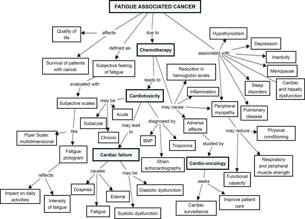 In chronic diseases like cancer and heart failure (HF), fatigue is a common and complex symptom from an etiological and pathophysiological point of view, thus, a relevant issue in the recent area of oncocardiology. Fatigue is prevalent in 80-90% of the oncological patients treated with chemotherapy and/or radiotherapy and affects approximately 50-96% of the individuals with IC. The toxicity attributed to chemotherapeutic agents can determine the patients’ degree of fatigue and may even predict their survival. In recent decades, the advancement of antineoplastic therapies has substantially impacted the survival of patients with cancer, and the risks of harmful effects from these therapies to the cardiovascular system have been increasingly described. Therefore, the cooperation between oncologists and cardiologists has led to the emergence of oncocardiology and the new concept of cardiac surveillance. Cardiotoxicity is one of the clinical complications in the treatment of cancer, and its typical manifestation is left ventricular systolic dysfunction. New diagnostic and therapeutic strategies have been employed in the cardiac surveillance of patients with cancer. Fatigue in these patients has been carefully studied with a multidisciplinary approach and with the development of visual scales to quantify and correlate better its real impact on these individuals’ quality of life and survival. The Fatigue Pictogram and Piper Fatigue Scale are tools increasingly used in research and clinical practice. The mechanisms involved in fatigue, from a conceptual point of view, may be of central (central nervous system) or peripheral (muscular skeletal) origin, both of which may be present in patients with cancer. The present review aims to discuss the new concepts in the assessment of fatigue in oncological patients. These concepts are fundamental to professionals who work in the emerging area of oncocardiology.
