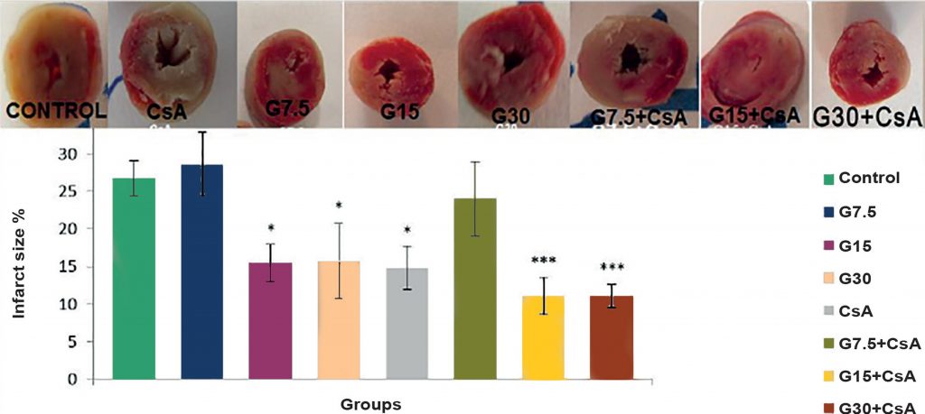This study aims at determining the effects of gallic acid (as Antioxidant) combined with cyclosporine A (CsA) (as mPTP inhibitor) on I/R induced cardiac and endothelial (role of NO) dysfunction.